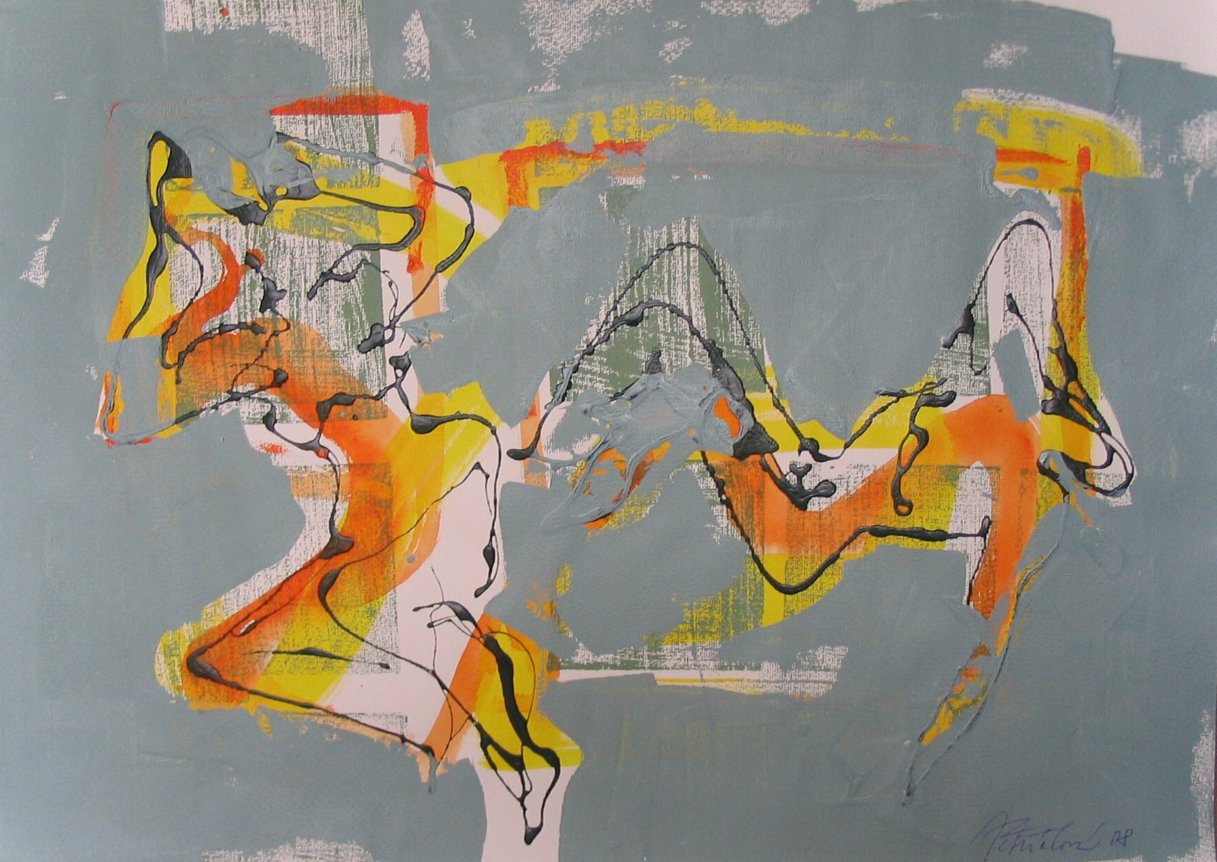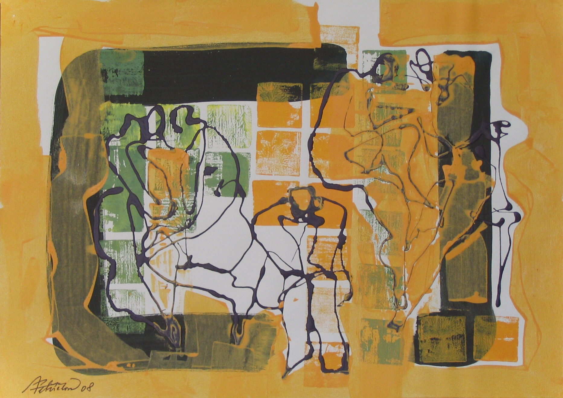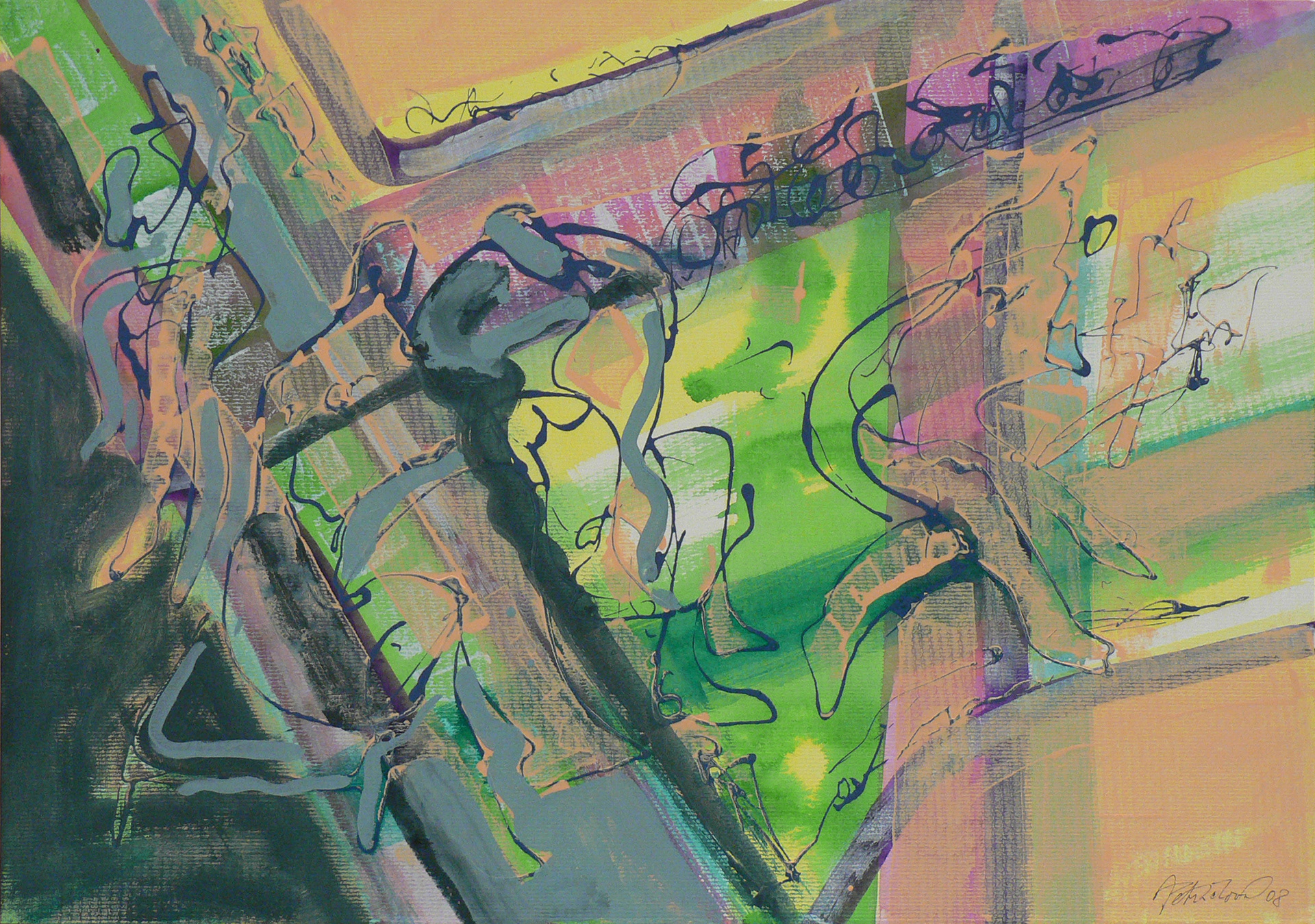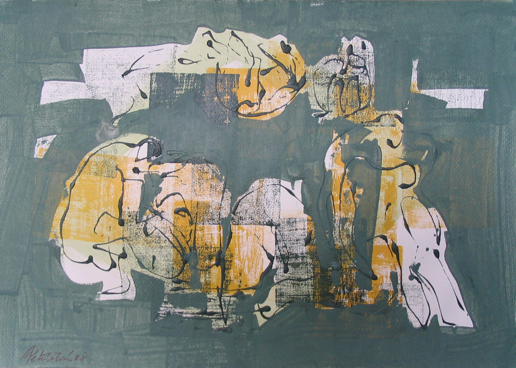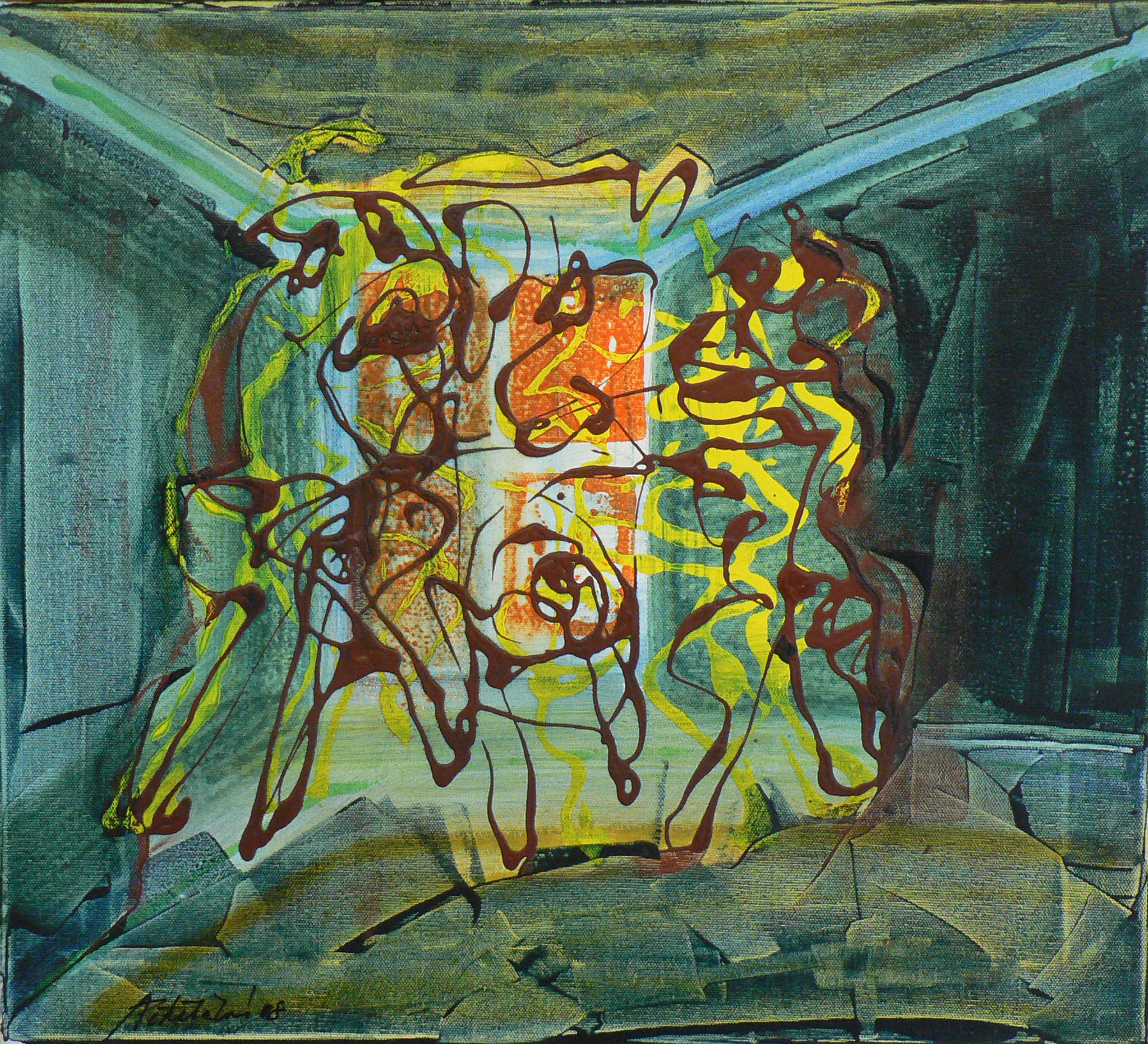 Schůzka, 2008, kombinovaná technika, akryl, papír, 50×70